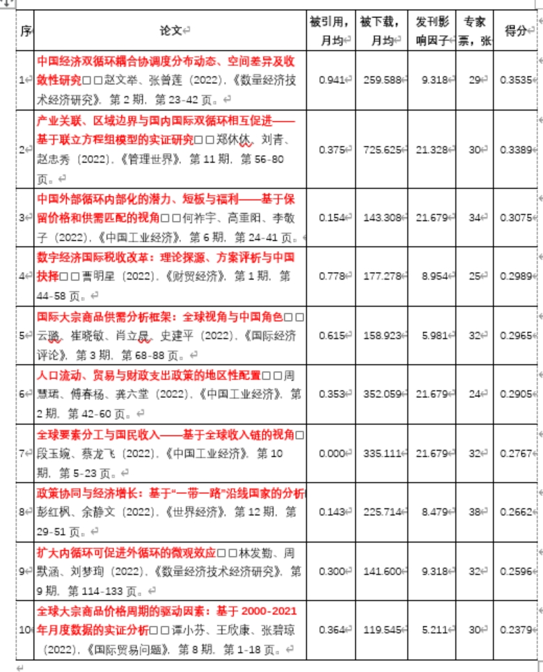 2022年世界经济学最佳论文TOP10榜单明细请参考: