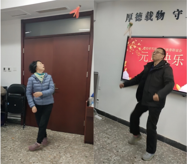 在接下来的踢毽子环节中,郝秉键、李军、欧阳和霞、李强等老师表演了花式踢毽。毽子在空中飞舞,左右脚踢,左右手托,运动无限,快乐无比!