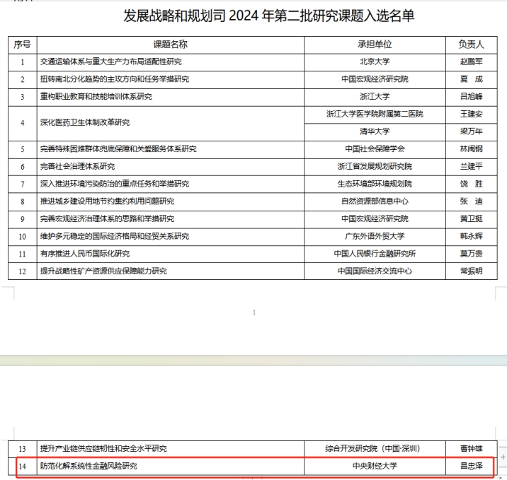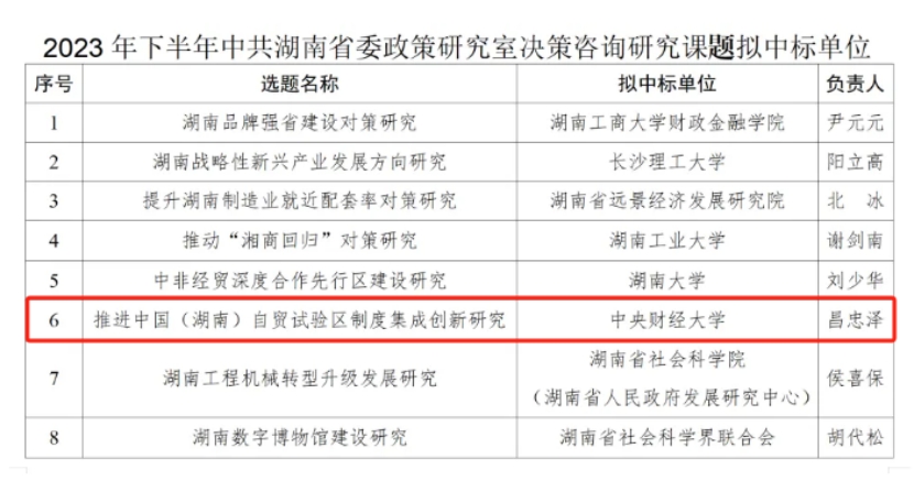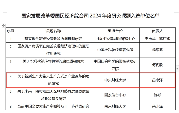 该课题旨在通过理论研究,深入理解新质生产力的科学内涵,探究生产方式变革的规律,预测产业变革的趋势,提出推动生产力发生质态跃迁的关键举措。该课题竞争十分激烈,全国有多达13家高校、科研机构申报。这是昌忠泽研究员自2024年4月19日中标国家发改委发展战略和规划司课题《防范化解系统性金融风险研究》之后,本年度第二次中标国家发改委课题,也是昌忠泽研究员2024年4月8日中标湖南省委政策研究室课题《推动中国(湖南)自贸试验区制度集成创新研究》之后,本年度第三次中标省部级横向课题。