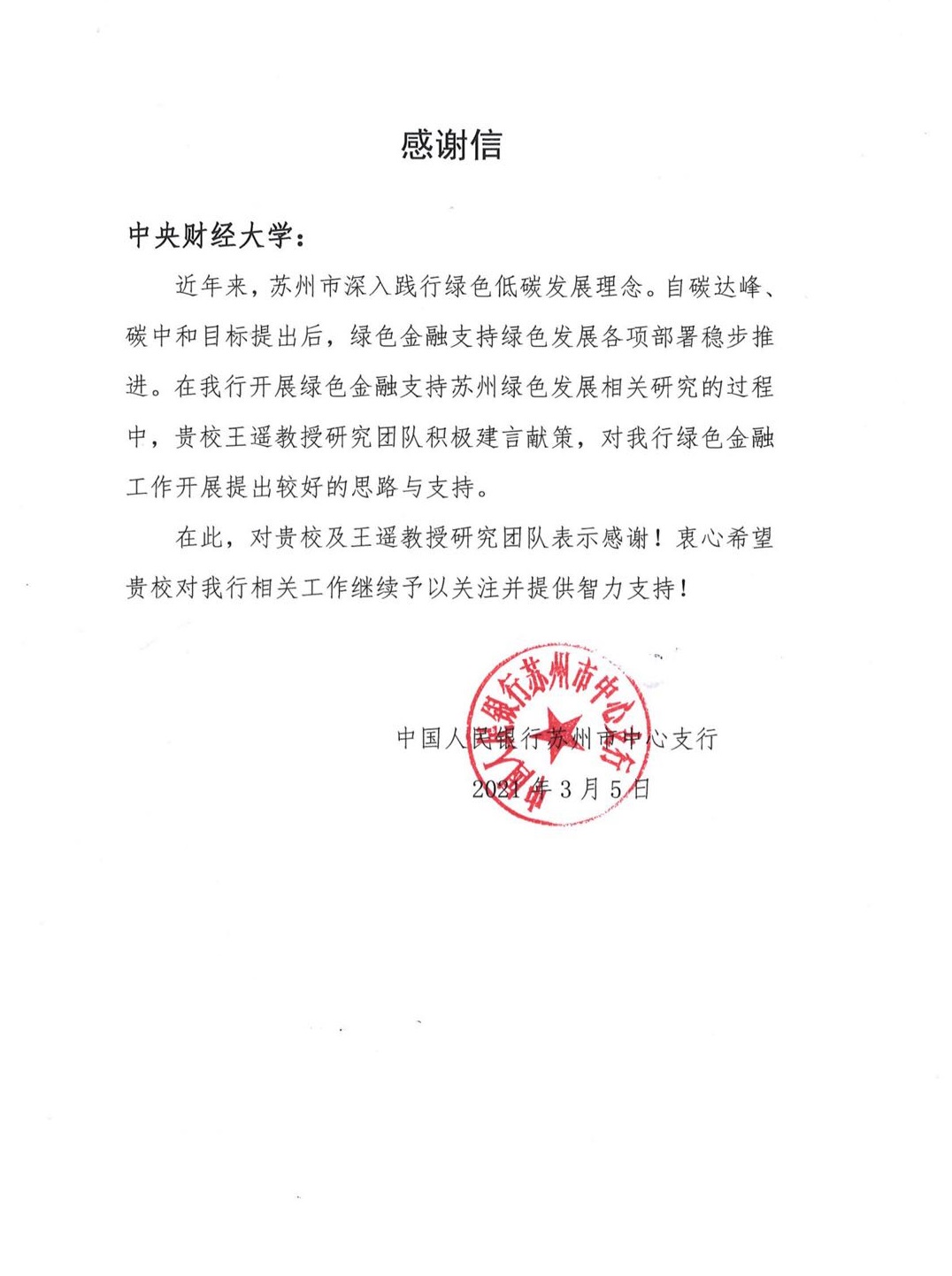 3月5日,中国人民银行苏州市中心支行向我校发来感谢信,对我院王遥教授研究团队在苏州市中心支行开展绿色金融支持苏州绿色发展相关研究中积极建言献策表示衷心感谢。