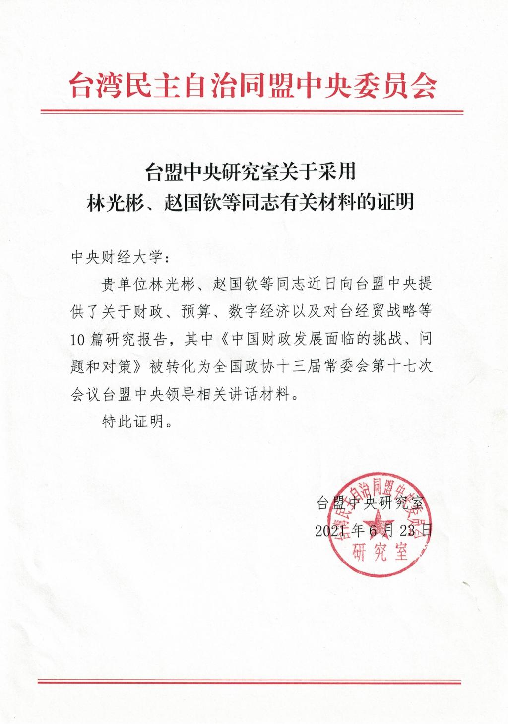 我院林光彬、赵国钦两位老师的研究报告被台盟中央采纳