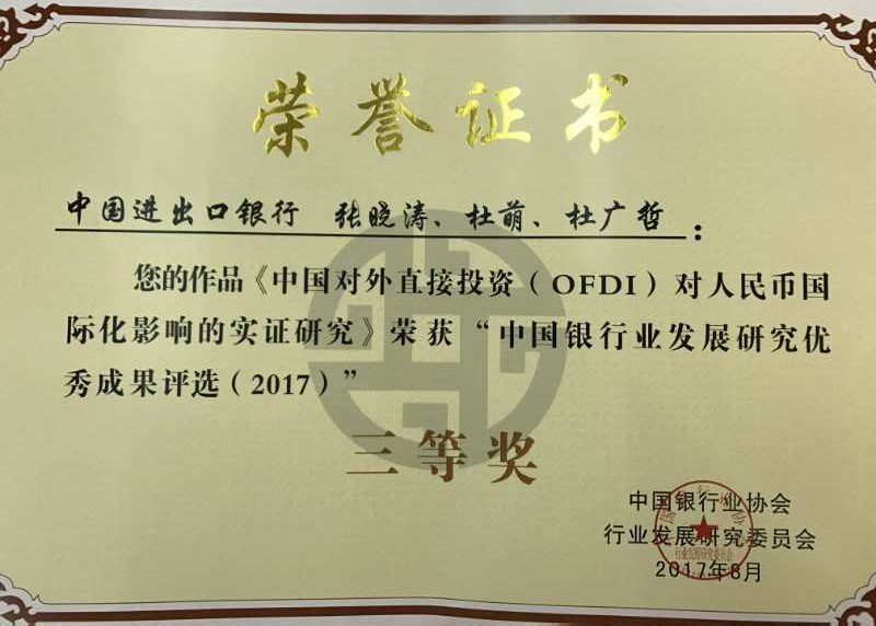 2017年8月4日,中国银行业协会举行“《中国银行业发展报告(2017)》暨中国银行业发展研究优秀成果评选(2017)发布会”,我院张晓涛教授为第一作者的论文《中国对外直接投资(OFDI)对人民币国际化影响的实证研究》获得三等奖(论文原文发表于《投资研究》,2016第11期,以论文第二作者所在单位中国进出口银行作为成果完成单位申报)。本次中国银行业发展研究优秀成果评选得到了会员单位的广泛响应和积极参与,共收到86家各类银行业金融机构及地方银行业协会选报成果1024项,评出特等奖(3名)、一等奖(10名)、二等奖(20名)、三等奖(30名)、优秀奖(90名)合计153项。