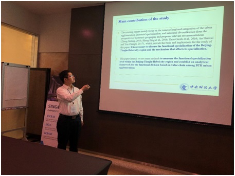 易云锋博士代表论文合作者展示了近期的工作论文《Intra-regional Urban Coordination and Sustainable Development: A Study on Functional Division in Beijing-Tianjin-Hebei (BTH) Urban Cluster from the Perspective of Value Chain》。该论文从价值链分工的视角分析了中国城市协同分工的运行机制和影响因素,阐述了基于价值链分工的城市职能分工与传统区域分工的不同之处,同时对衡量城市职能专业化的相关指标进行梳理。最后,他以京津冀城市群为例,生动展示了城市群内部各城市在2003-2016年期间的主要职能分工特征和演变趋势。