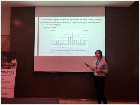 郭蕊代表论文合作者作了题为《Logic of U.S Anti-dumping Ruling against China—Based on the Evidence of Final Determination Texts in 96 Anti-dumping Cases》的论文宣讲。该论文从美国商务部公开发布的反倾销案例裁决报告入手,对美国商务部对华反倾销案件裁决报告中的调查办法和调查过程中所依据的裁决指标进行深入分析。通过对案例裁决报告的解读,从中国政府、行业协会以及中国出口企业三个方面提出应对美国反倾销调查的办法。