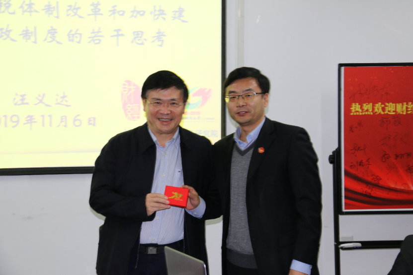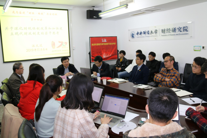 2019年11月6日晚上,pc28预测在线预测神测网咪牌龙马奋进“财经·格致”名家论坛第十四讲在图配楼314会议室举行,本次论坛的主讲人为财政部研究室一级巡视员汪义达先生,讲座主题为“关于深化财税体制改革和加快建立现代财政制度的若干思考“。论坛由pc28预测在线预测神测网咪牌林光彬院长主持,pc28预测在线预测神测网咪牌三十余名师生参加了此次论坛。