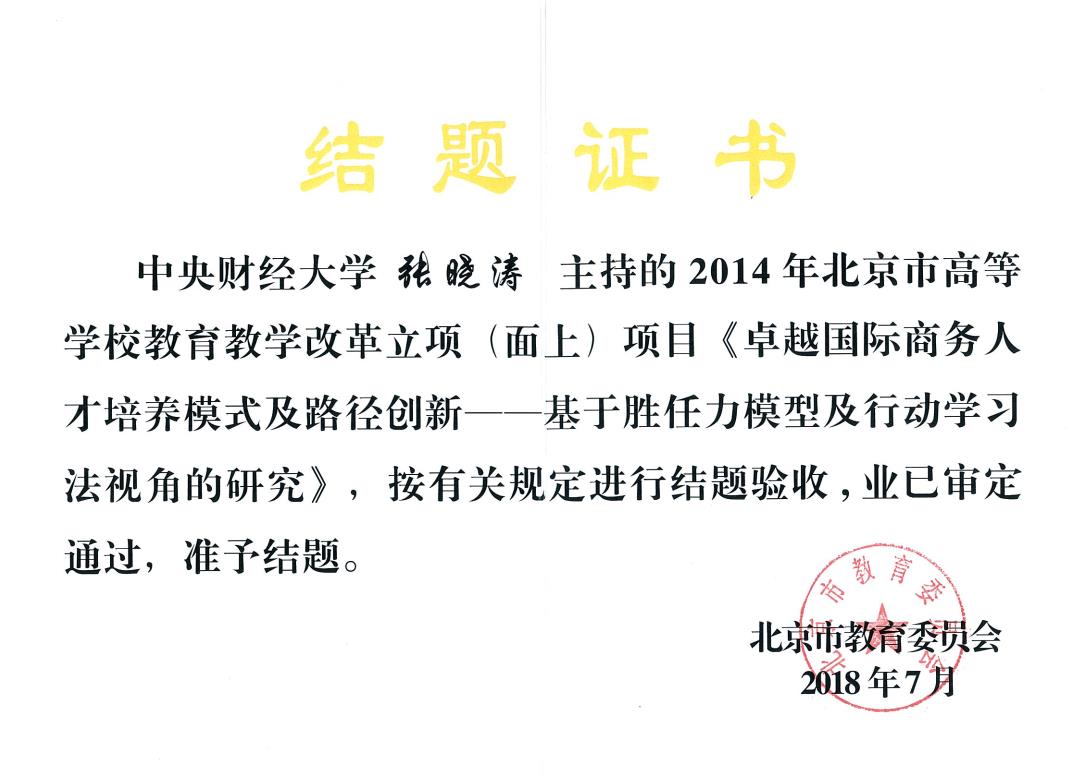 课题组负责人张晓涛教授撰写的研究报告《国际化背景下国际商务人才需求与培养》,2016年获得北京市高等教育学会第九次高等教育科学研究优秀成果二等奖