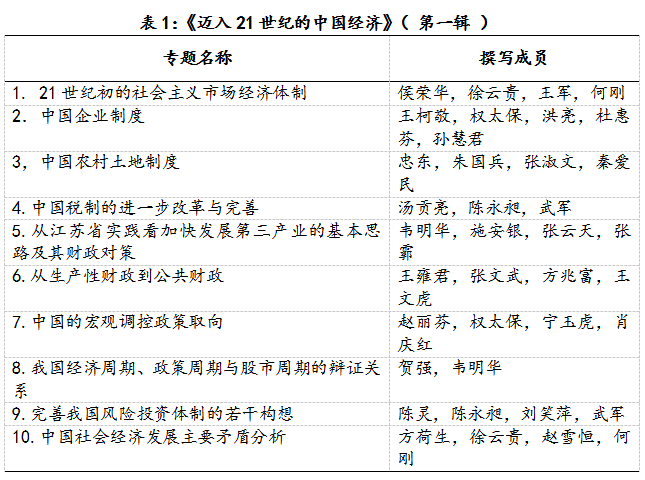 王柯敬(时任中央财经大学校长)为第一辑主编,召集主题讨论。主题的设置主要围绕世纪初我国社会主义市场经济体制、企业制度、农村土地制度、财政税收制度、宏观调控政策取向、风险投资体制等一系列主题,结合江苏省经济社会快速发展中的实践经验,对我国经济制度、政策的历史沿革进行了梳理,并对未来改革方向与亟待完善的方面进行了总结(见表1)。