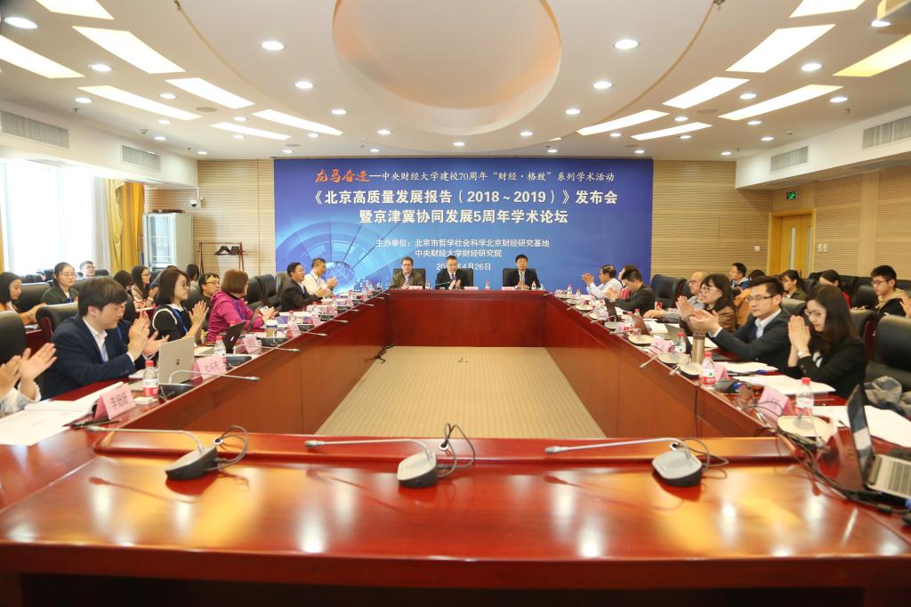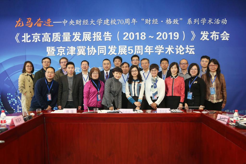 “春秋多佳日,登高赋新诗”。2019年4月26日下午,龙马奋进——中央财经大学建校70周年“财经·格致”系列学术活动《北京高质量发展报告(2018-2019)》发布会暨京津冀协同发展5周年学术研讨会在中央财经大学学术会堂604室成功举办。本次论坛由北京市哲学社会科学北京财经研究基地和pc28预测在线预测神测网咪牌主办。来自国家发改委宏观经济研究院、中国社会科学院、北京市发展和改革委员会、联合国环境署、北京大学、北京师范大学以及中央财经大学的师生等50余人参与了本次会议。会议开幕式由pc28预测在线预测神测网咪牌院长、北京财经研究基地首席专家张晓涛教授主持。