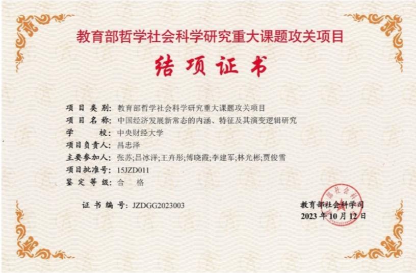 由我院昌忠泽研究员为首席专家承担的教育部哲学社会科学研究重大课题攻关项目《中国经济发展新常态的内涵、特征及其演变逻辑研究》,经过七年的联合攻关,今年3月提交结项申请,近日,顺利通过教育部社会科学司结项验收结项审批。