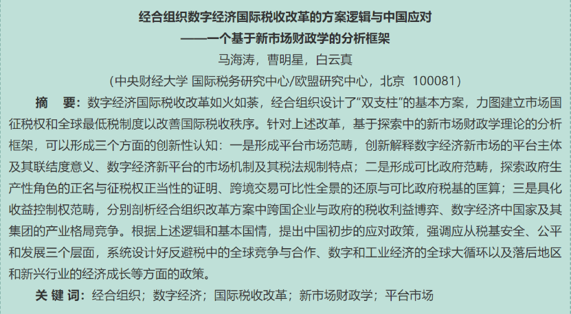 2022年第1期《当代财经》推介发表我院曹明星老师作为通讯作者撰写的探讨国际税改财政学基础问题的学术长文“经合组织数字经济国际税收改革的方案逻辑与中国应对 ——一个基于新市场财政学的分析框架(马海涛、曹明星、白云真)” 。