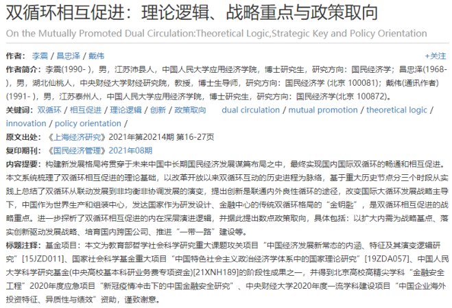 我院昌忠泽研究员及合作者发表在《上海经济研究》上的学术论文“双循环相互促进:理论逻辑、战略重点与政策取向”,被人大复印报刊资料《国民经济管理》(2021年第8期)全文转载。截止到目前,昌忠泽研究员共有13篇学术论文被人大复印报刊资料全文转载。