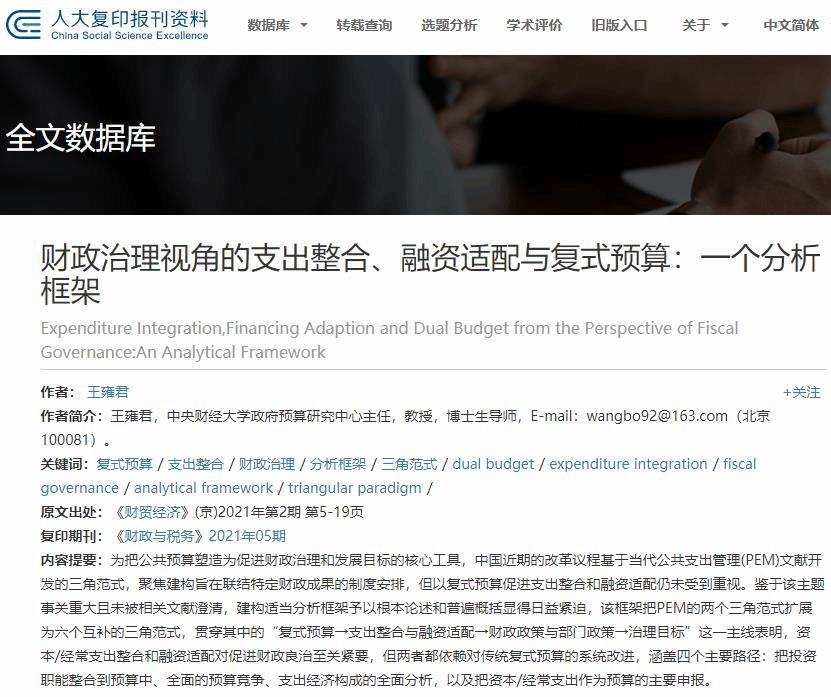 我院王雍君教授在《财贸经济》2021年第2期发表的论文《财政治理视角的支出整合、融资适配与复式预算:一个分析框架》,被人大复印报刊资料《财政与税务》(2021年第5期)全文转载。截止到目前,王雍君教授共有23篇学术论文被人大复印报刊资料全文转载。