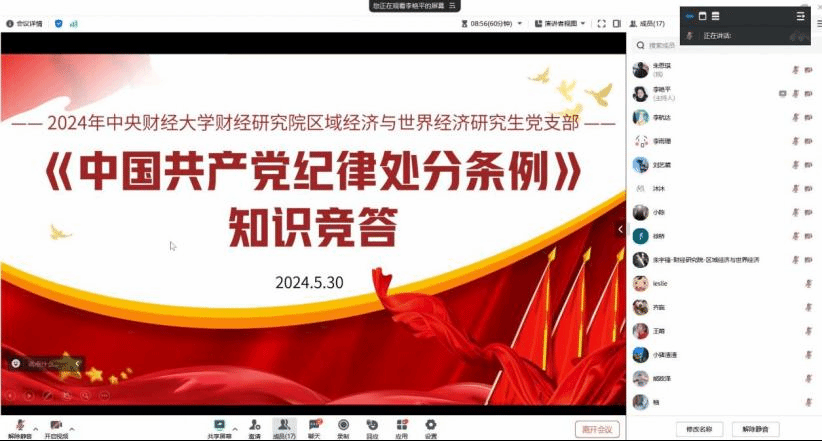 为深化党纪学习教育,我院区域经济与世界经济研究生党支部于2024年5月30日下午四时,通过线上平台举办了《中国共产党纪律处分条例》知识竞答比赛。此次活动由学生党支部副书记李艳平同学主持,得到了全体党员、发展对象和积极分子的热烈响应,共计20人踊跃参与。